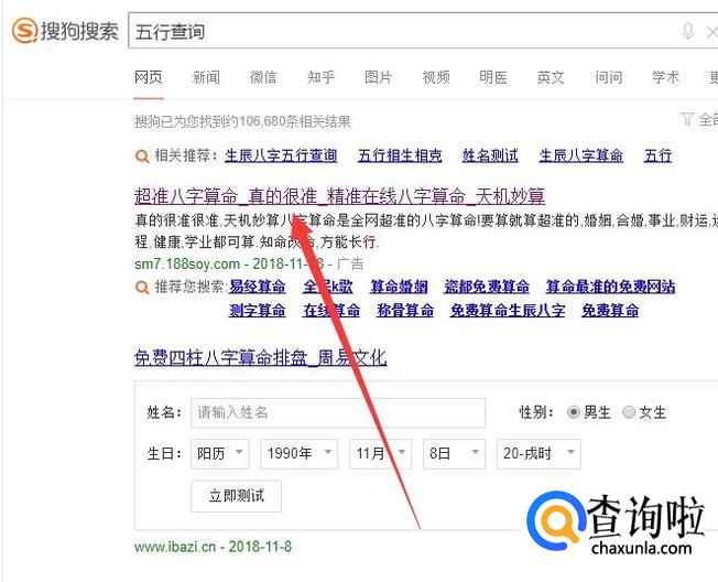 进入之后,搜索“五行查询”,点击并进入,如图所示。
