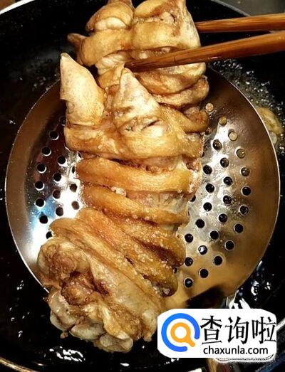 接着我们在锅中烧油,油温七成热下入猪蹄,炸至金黄捞出控油备用