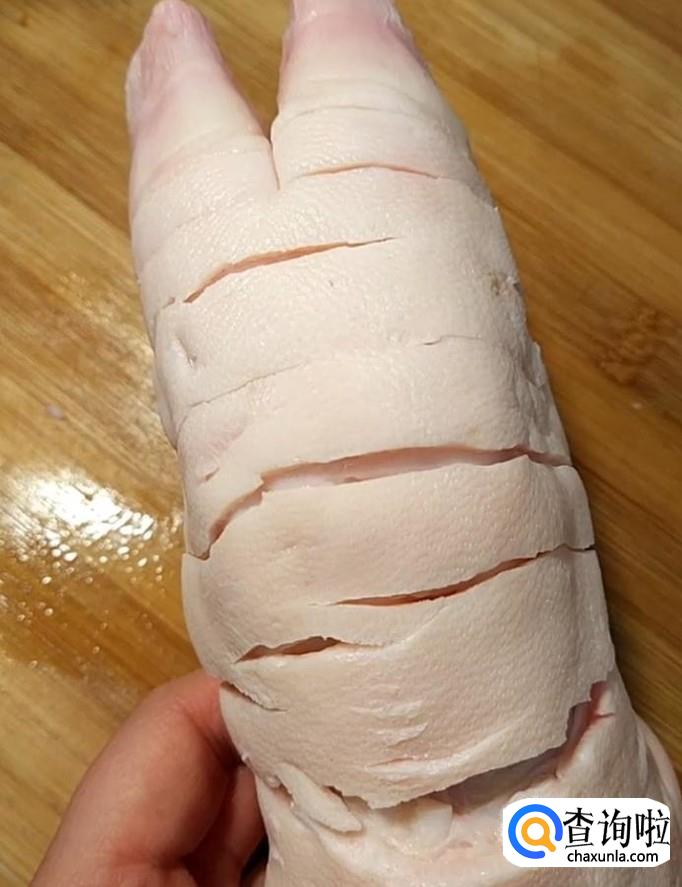 首先,我们将猪手清洗干净,在上面改刀方便入味,放入热水锅中焯一下捞出,清洗干净控干水分备用