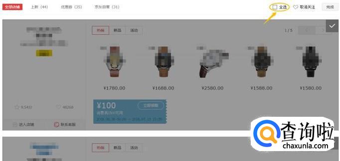 我们点击此页面右上角的"批量操作",然后依次点击"全选"-"取消关注",这样我们就可以对这些店铺进行快速的一键取消了;