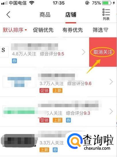 点击该项,之前关注的所有店铺会有列表的形式展示给我们,我们将其中某一个店铺向左滑动就可以取消关注了,如下图;
