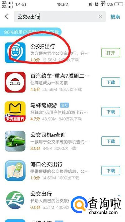 首先,我们去应用商店搜索下载安装"公交e出行"app。