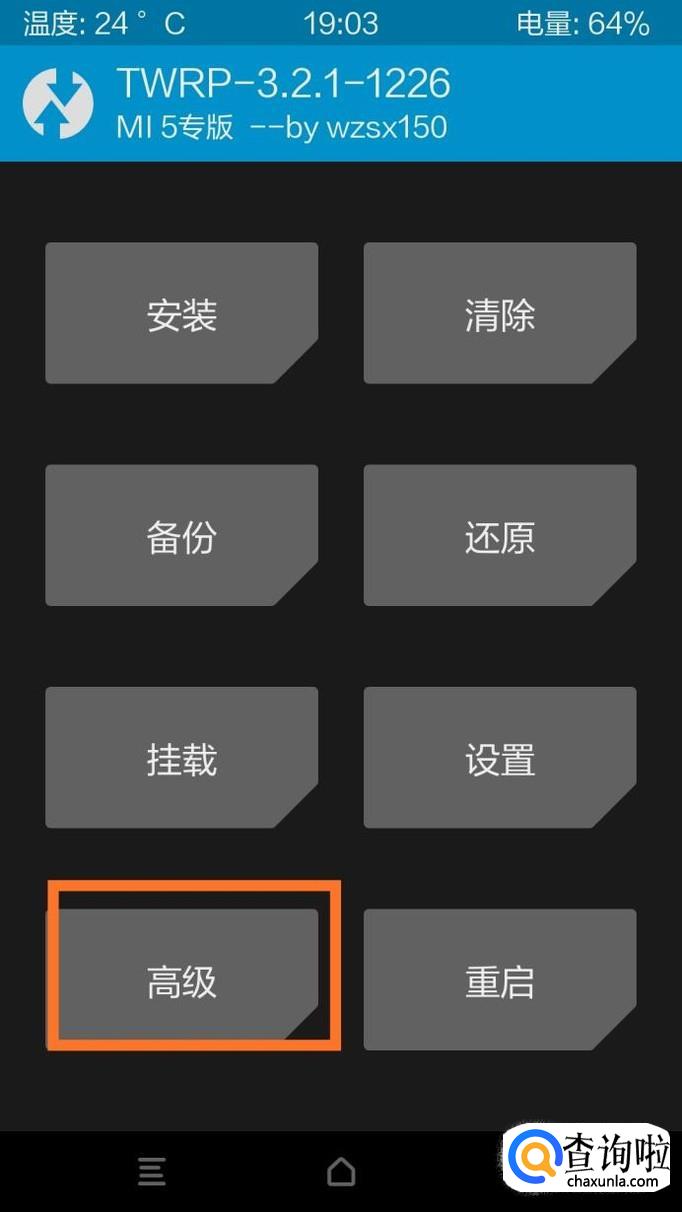 长按电源键和音量加键进入rec模式,选择“高级”。