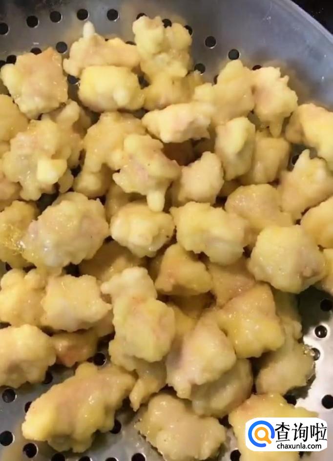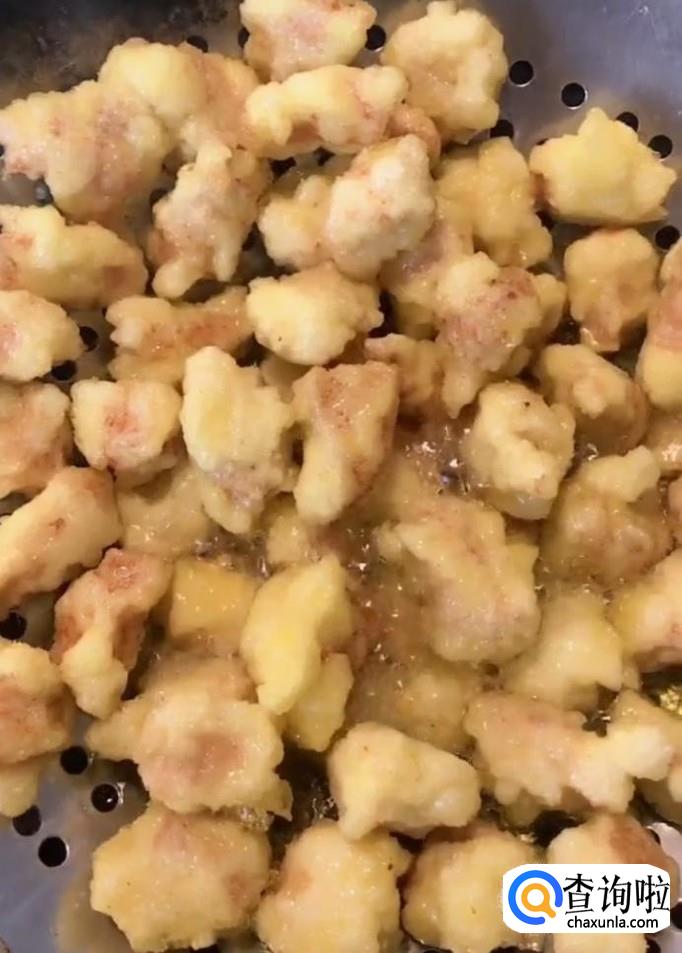 待油温升至八成热再次下入猪里脊肉复炸一下,炸至金黄酥脆,放入辣椒一起炸一下捞出备用