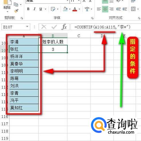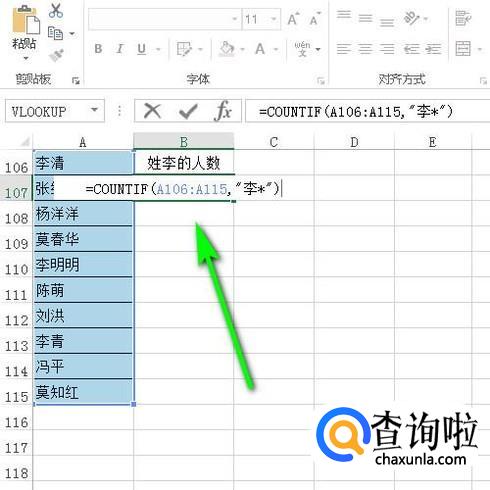 我们在B107输入公式:=COUNTIF(A106:A115,"李*")