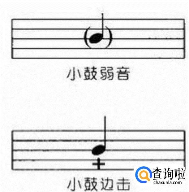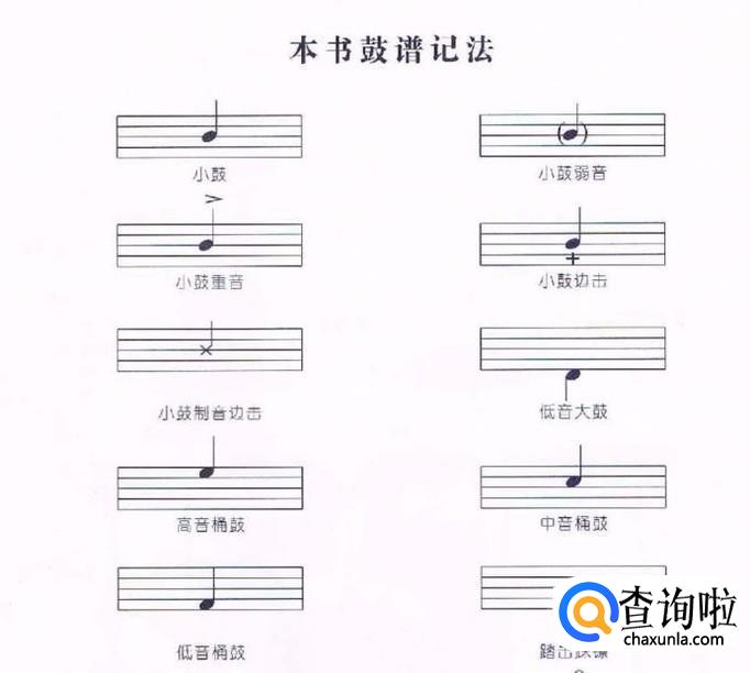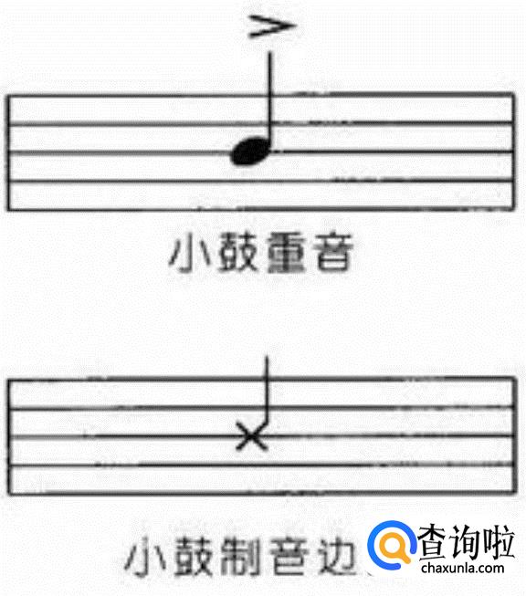 在”鼓“上的其他的音符与一般其他乐器谱的音符类似,音符上面的>代表重音,音符下面的+代表边击,音符上有括号代表弱音。
