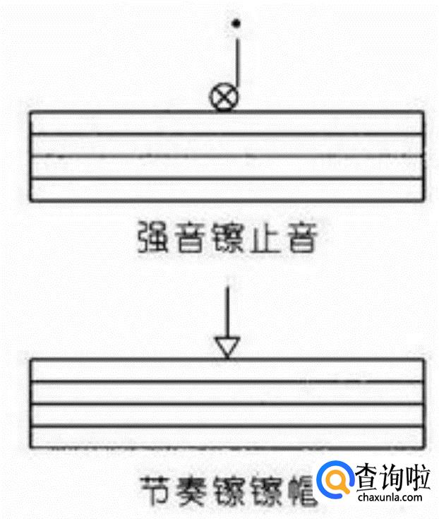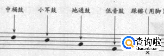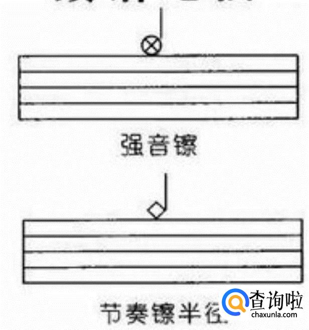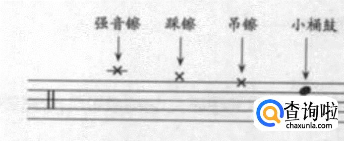 在“镲”上的音符有些特别,镲的音符为×,镲外面有个圈代表强音镲,音符上有个点代表音镲止音,音符上有个小圈代表手机才镲开镲。