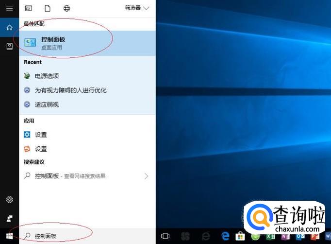 如图所示,搜索框输入"控制面板"。Cortana(小娜)显示搜索结果,点击"最佳匹配→控制面板"项。