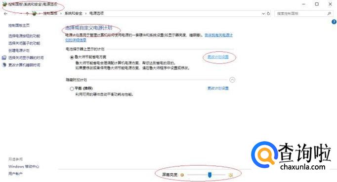 唤出"电源选项"用户界面,如图所示。滑动下方"屏幕亮度"滑块达最亮,点击"更改计划设置"按钮。
