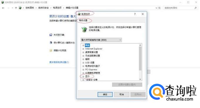 弹出"电源选项"对话框,如图所示。选项区点击展开"显示"目录,选择希望计算机管理的电源设置。
