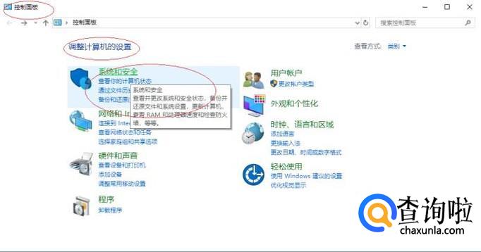 唤出"控制面板"程序窗口,如图所示。点击"系统和安全"图标,用于查看并更改系统和安全状态的设置。