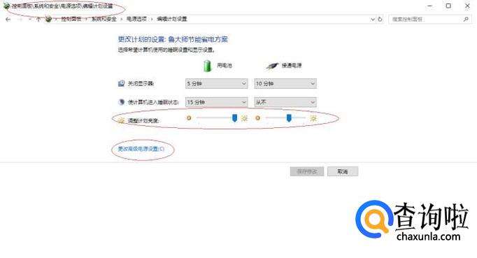 如图所示,唤出"编辑计划设置"选项界面。滑动"调整计划亮度"滑块达最亮,点击"更改高级电源设置"按钮。