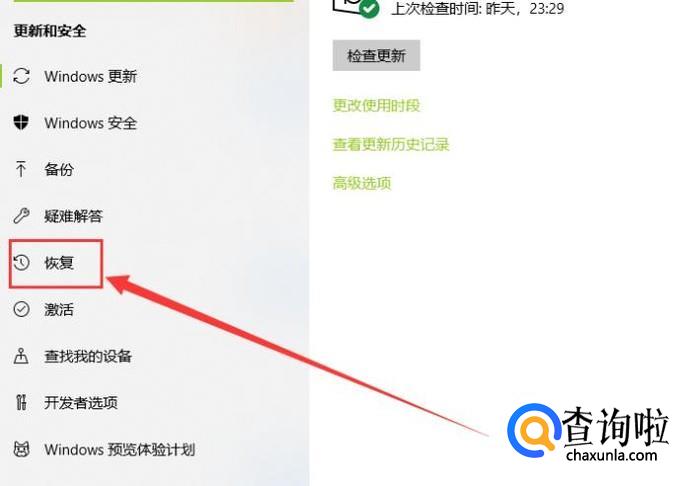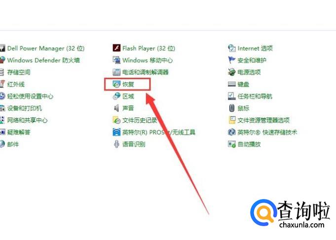 在控制面板页面,点击“恢复”,进入下一页面,如图所示。