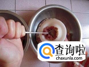 最后我们开始灌香肠,先用白线将大肠的一头系好,然后开始灌,这里给大家说一个技巧,就是我们可以先去买一个塑料漏斗,将肉放到漏斗里,然后用大肠接着漏斗口,这样方便省事。