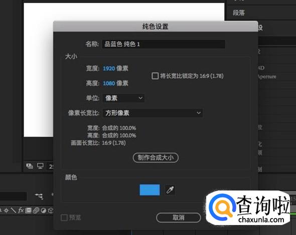 在纯色设置界面,将高宽设置为同合成一样,点击“确定”