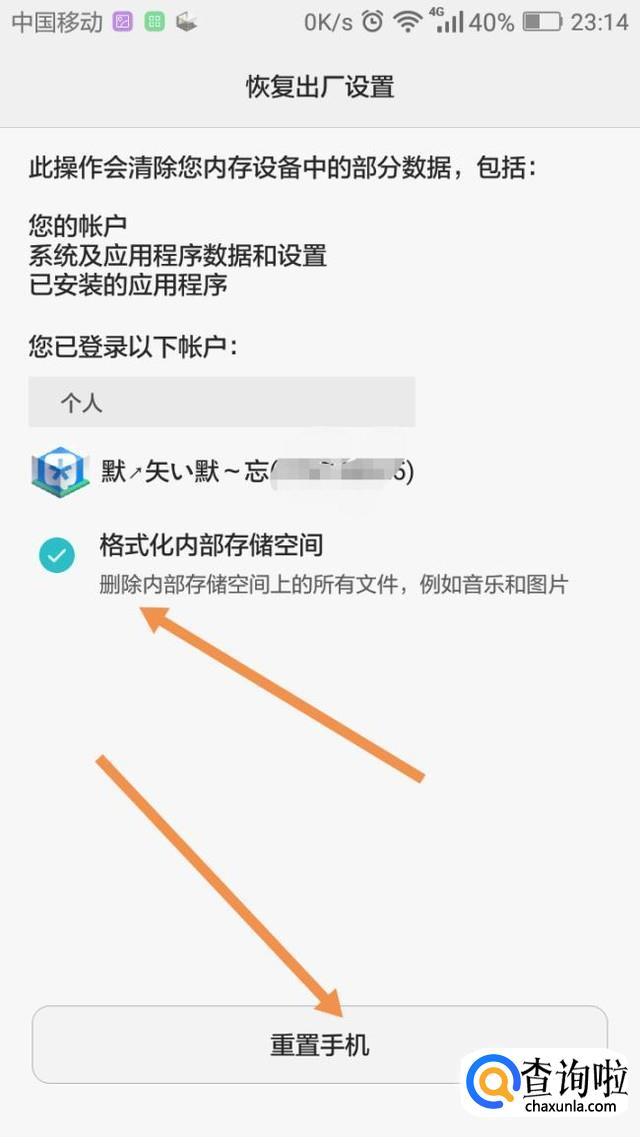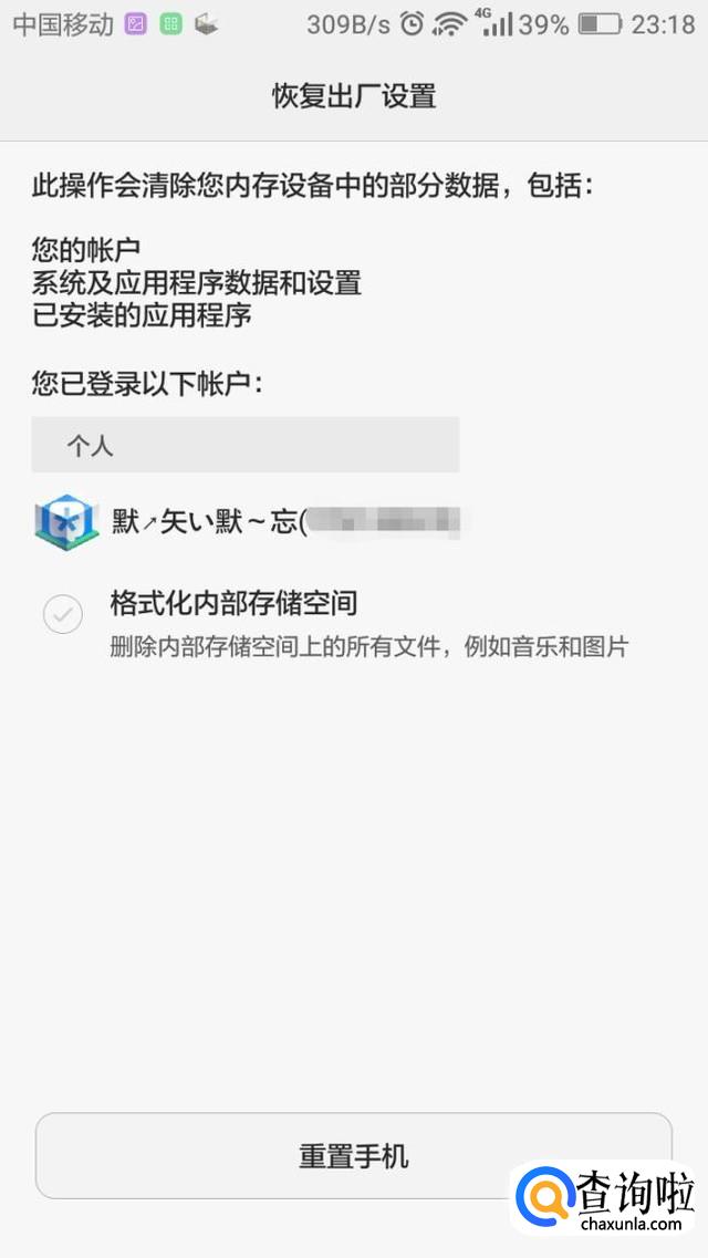 在恢复出厂设置页面,勾选格式化内部存储空间。这个可以根据个人需求选择是否勾选。然后点击重置手机即可。
