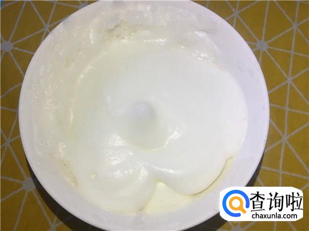 用电动打蛋器打蛋清,分三次打,先把蛋清打到起泡泡后,加入一勺白砂糖,然后再继续打,等到蛋清打发成白色泡沫时,再放入一勺白砂糖,最好把蛋清打发到提起来不掉下去的状态,就可以了。打发蛋清的过程很重要哦。