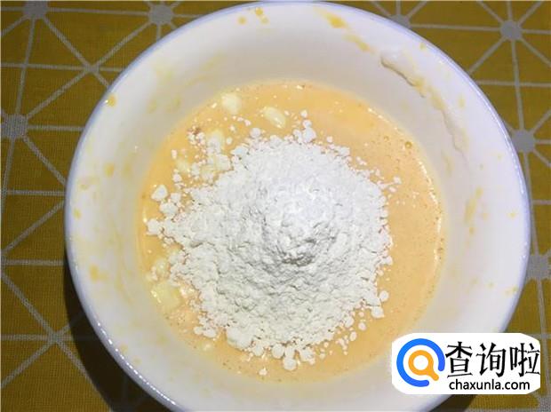 准备一个过滤网,把蛋糕粉倒入过滤网中,然后把蛋糕粉跟鸡蛋液、牛奶一起搅拌均匀,搅拌到没有颗粒为止。