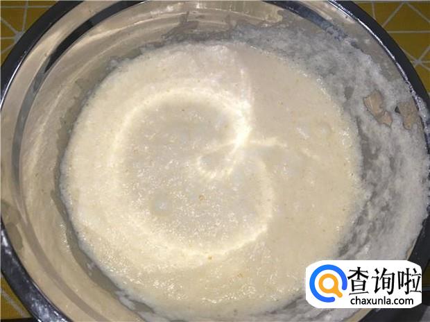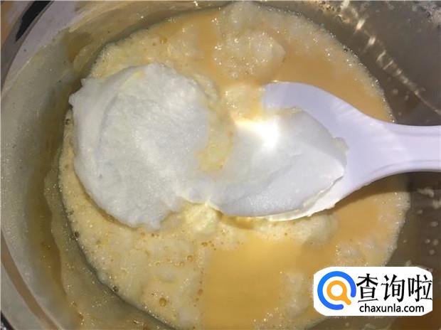 用一个刮刀,或者饭勺,把蛋白一点点加入到蛋黄中,不要绕圈哦,要上下搅拌,最后把所有蛋白都和蛋黄混合。