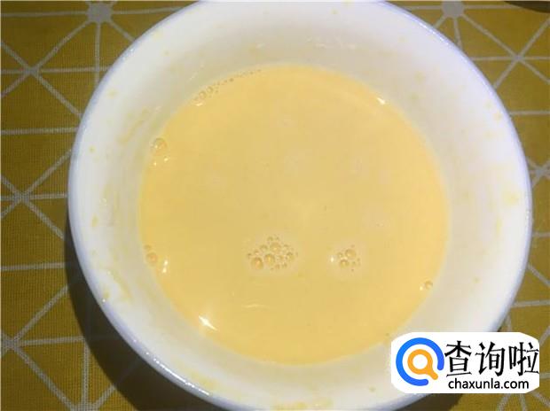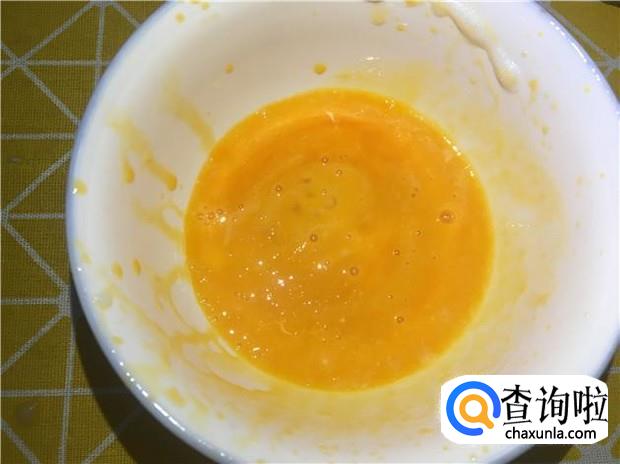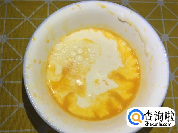 把蛋黄均匀打散,然后两勺白砂糖,打散均匀,然后把一盒牛奶倒入,用筷子搅拌均匀即可。