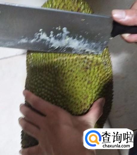 开始用刀切,最好选择厚的水果刀,更容易发力,否则菠萝蜜厚厚的皮不容易切断。边切边用手辅助剥。