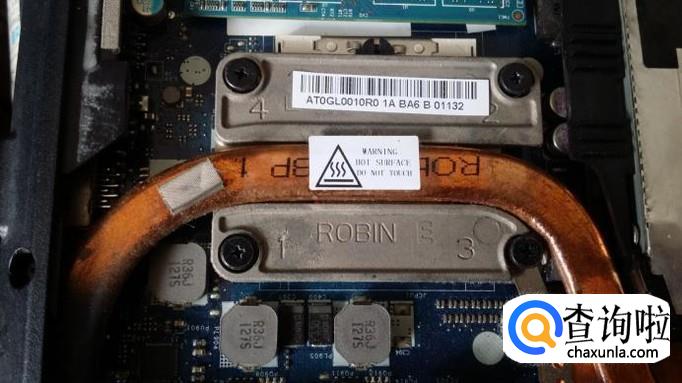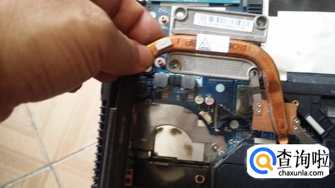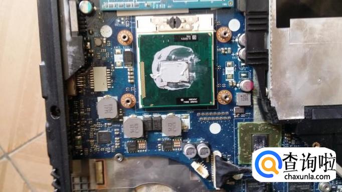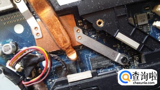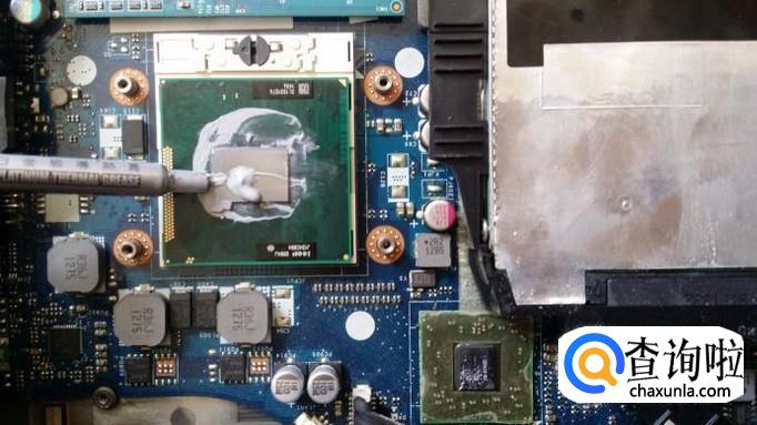 把CPU上的残余硅脂擦净,再重新涂上,抹平。显卡芯片上不用涂,因为这款笔记本显卡是通过散热器上粘贴的导热硅胶片散热的。