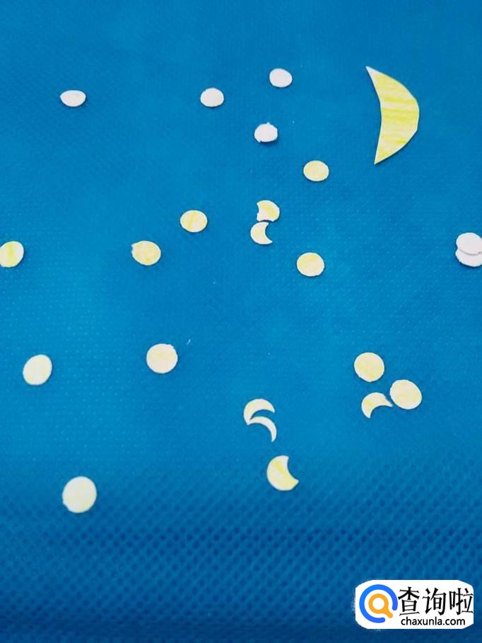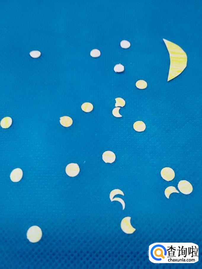 将月亮和圆形小纸片背面抹上胶棒,粘在不织布上,夜晚的星空就做好了。
