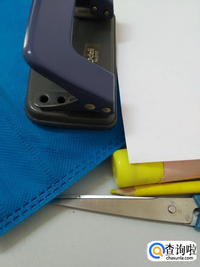 准备蓝色的不织布、打孔器、纸、胶棒、剪刀、黄色彩笔。