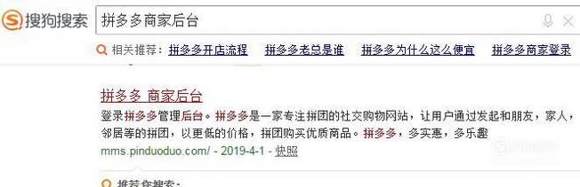 打开搜索引擎,在输入框输入拼多多商家后台,点击打开。如图所示。