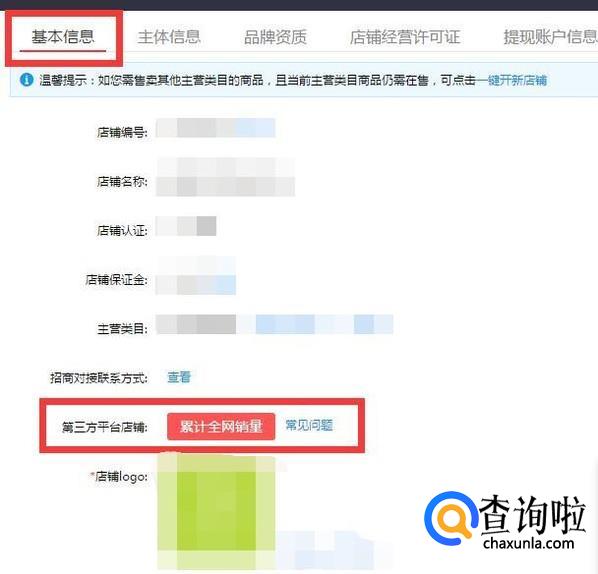 然后点击基本信息,再点击第三方平台店铺右侧方的按钮累计全网销量。如图所示。