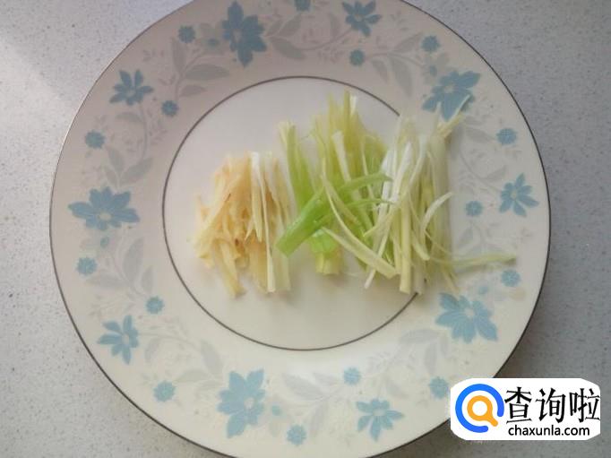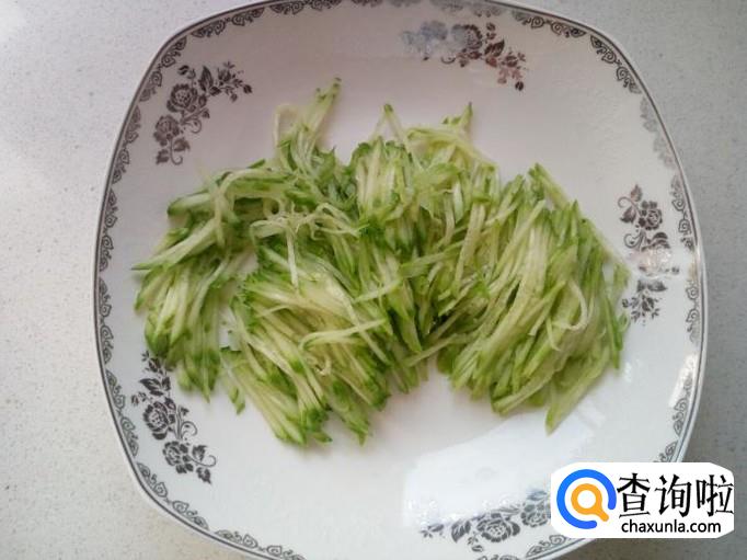 黄瓜用水清洗干净,控干水分,切成细丝(不要切的太粗,否则不易熟)。