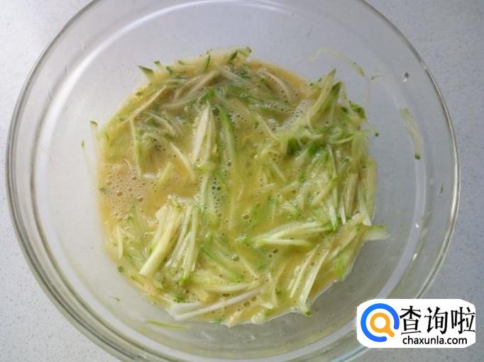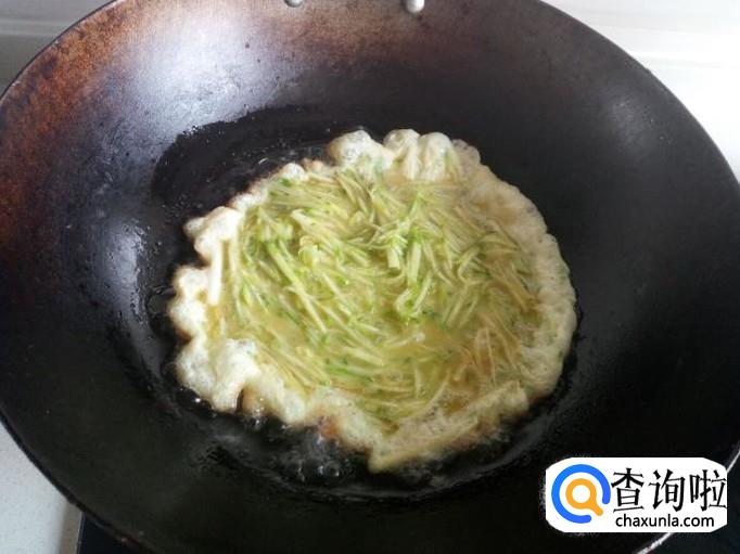 锅内放入油加热(油不要太少),油热后放入黄瓜鸡蛋液小火煎塌。