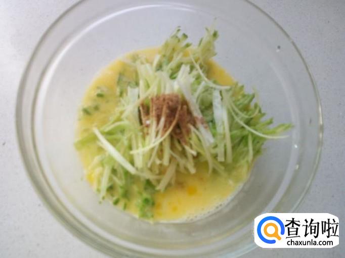 把切好的黄瓜丝,葱,姜丝放入鸡蛋液中。放入五香粉,盐,味精,拌和均匀。