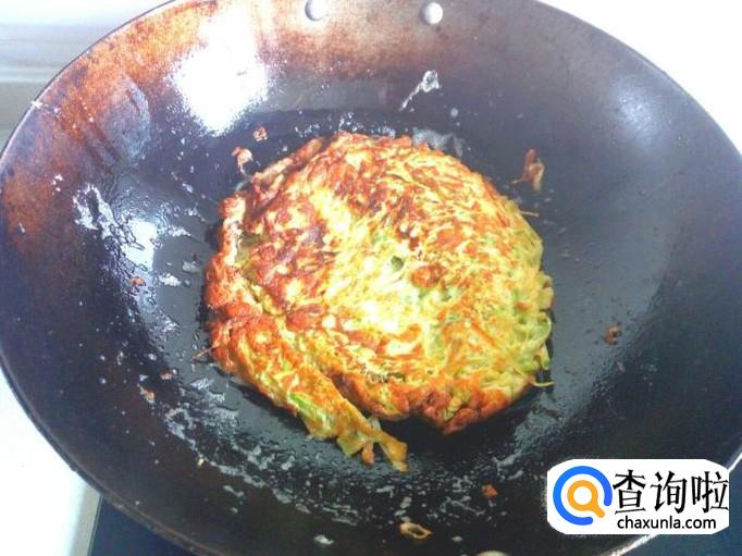 煎塌至黄瓜鸡蛋液凝固成饼状后,晃动锅,使鸡蛋饼与锅底脱离,然后颠勺翻个,煎塌另一面。