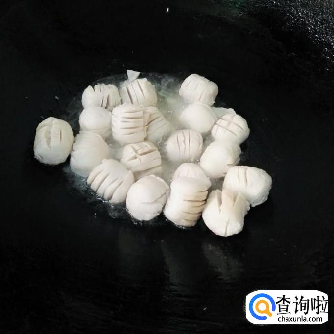 这是新鲜肉丸子,不用解冻,像切鱿鱼那样打成花,竖着切再横着切,但不要切断,做出来还是整个的,但是更容易入盐味,也好看。