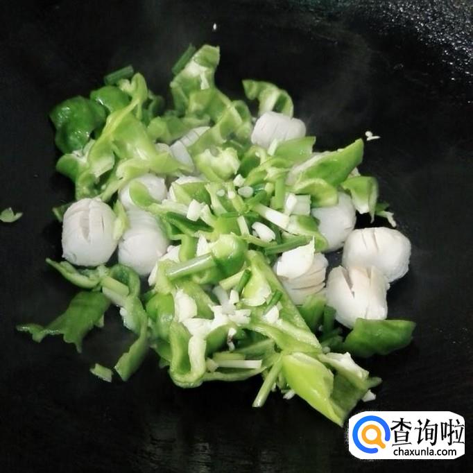 猪肉丸 350克 青椒 三个 大蒜籽 三瓣 香葱 二根 生粉 一勺 鸡粉 半勺 白糖 半勺