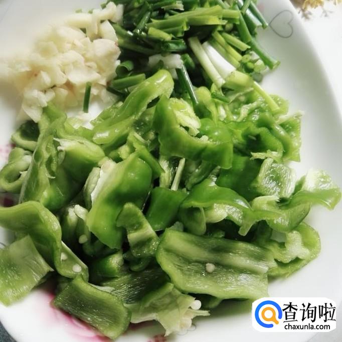 把辣椒切开,把辣椒籽去掉,再洗干净切片备用。大蒜籽去皮切碎,香葱洗干净切成段,都放在一个盘子里备用。