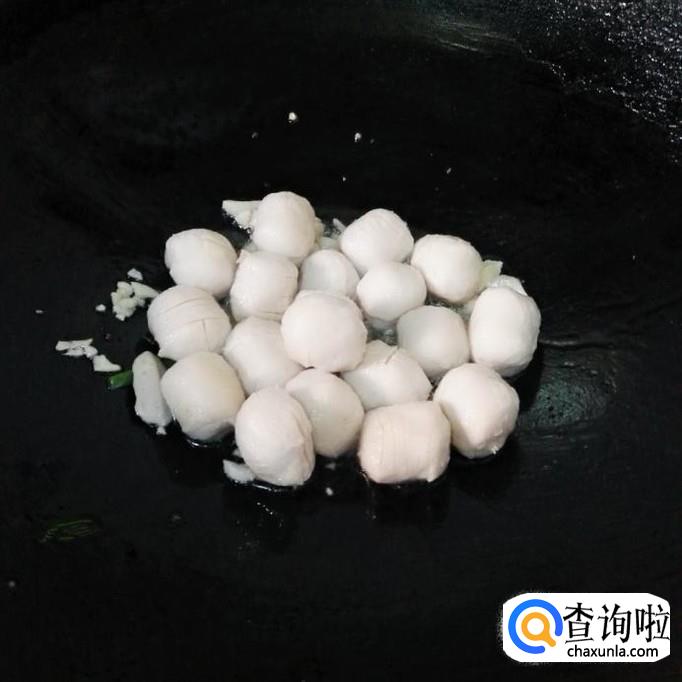 锅烧七成热,放适量花生油,把打了花的肉丸子倒下去,中火翻炒一下,然后再放半碗水煮干。