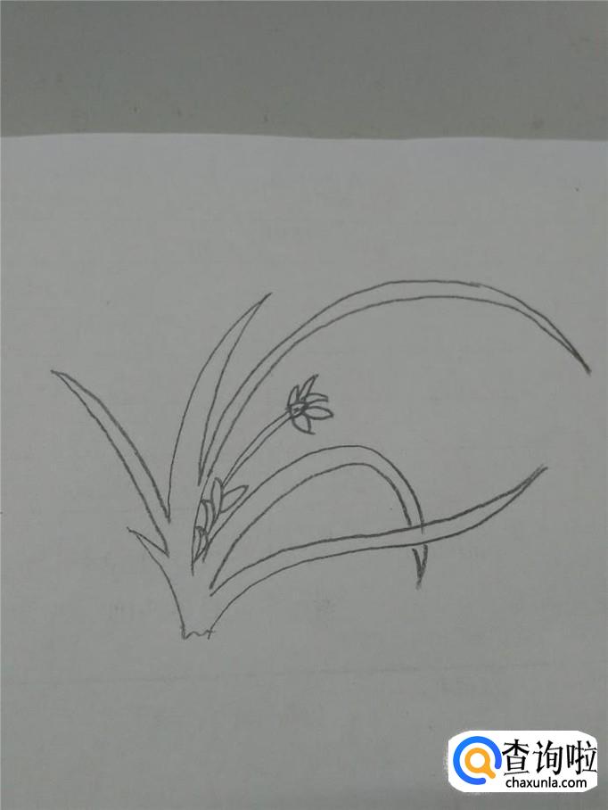 在花骨朵的上面画两条弯弯的线,表示花茎,在花茎末端画一朵简单的兰花,只画几片树叶形状的花瓣即可,到此,兰花就画完了。