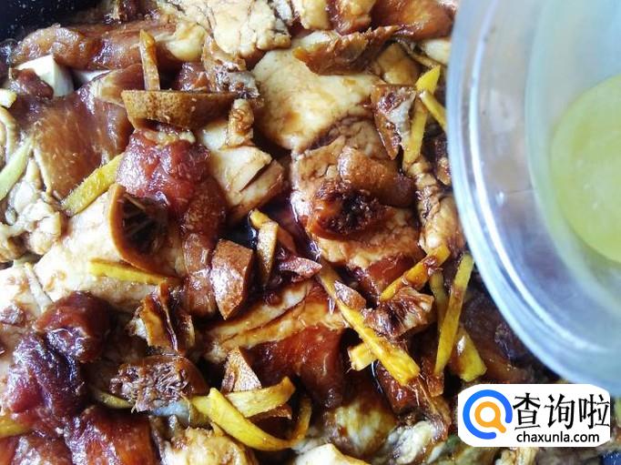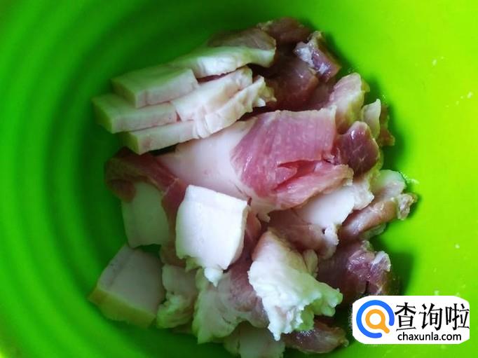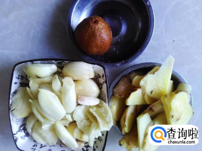 蒜米拍扁,嫩姜切成薄片,腌制过的柠檬准备好,猪肉切成片。