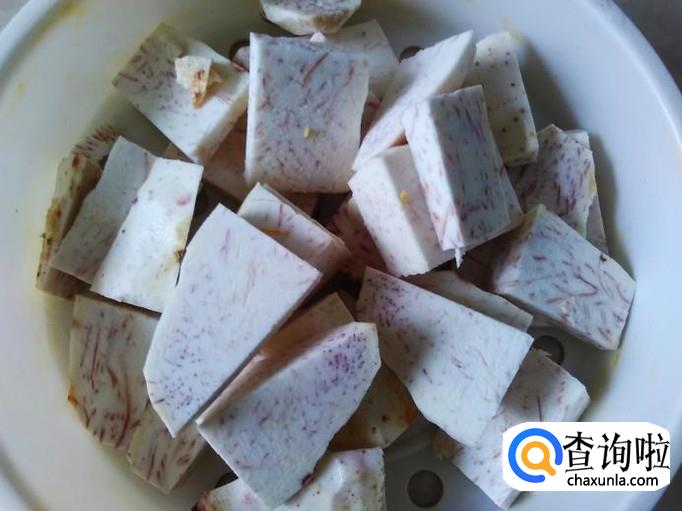再铺上香芋片,最后把腌制好的肉片铺盖住。