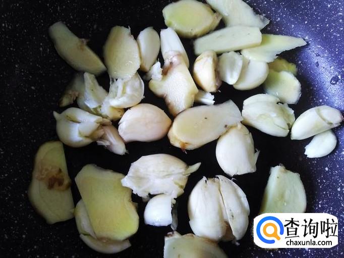 用一个小平底锅,首先把蒜米、姜片摆到锅底,然后把泡好的腐竹铺上去。【腐竹不用抓干水份】