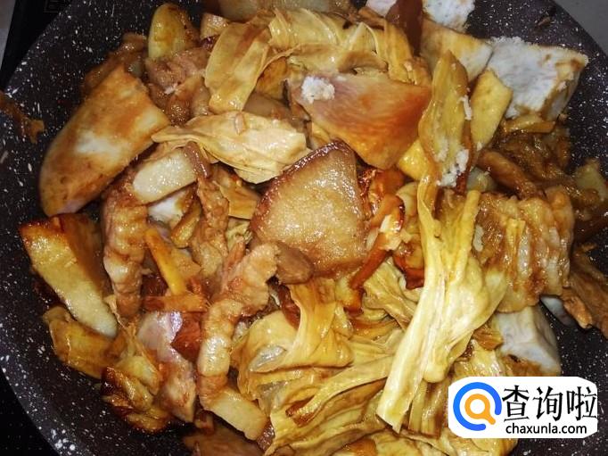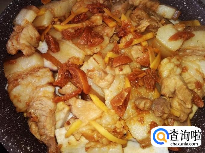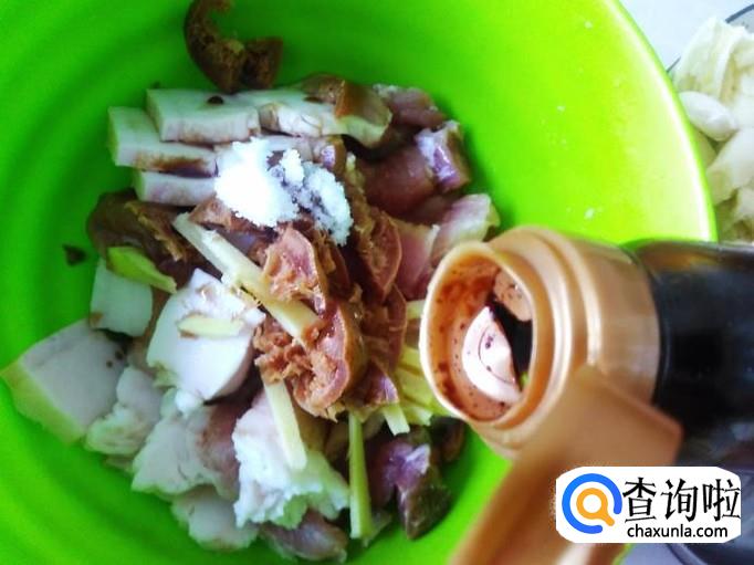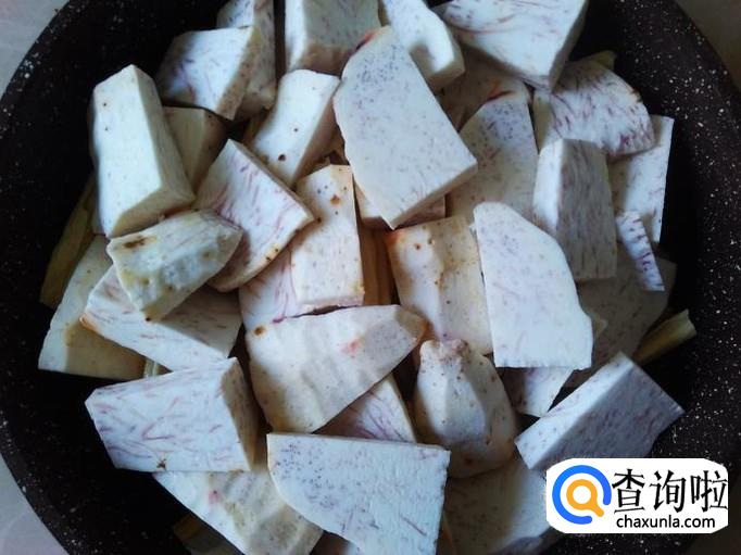 半肥瘦猪肉200克,香芋1个,腐竹50克,蒜米40克,嫩姜30克,生抽2勺,料酒1勺,老抽几滴。