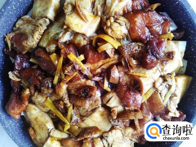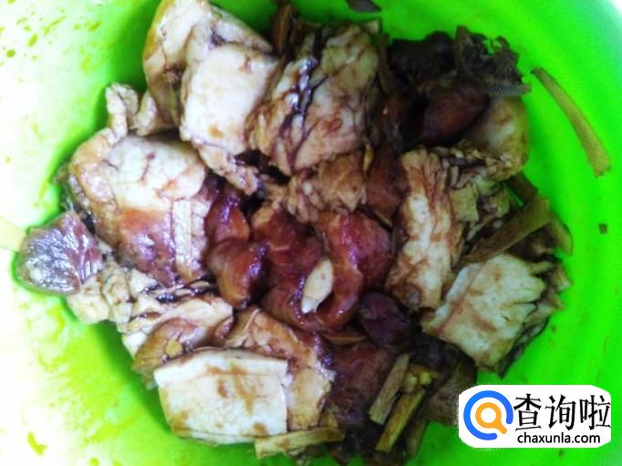 把柠檬切成碎丁然后放到肉片里,再加适量的盐、2勺生抽,1勺料酒,几滴老抽腌制30分钟。【味道加浓点,因为干锅的时候就不下配料了】