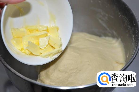 揉好之后将面团稍微抻开点儿,加入适量的黄油进行搓揉,黄油事先进行软化,最后一只揉下去变光滑和有弹性,最后就能够进行发酵了。