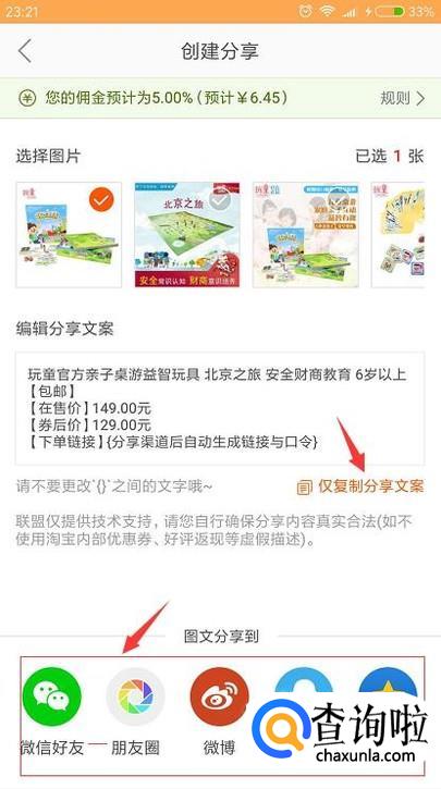 点进商品的详情我们可以复制文案然后转发给好友,好友购买后我们就能得到佣金了。