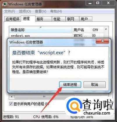 如果要终止需要按Ctrl+Alt+Delete开启任务管理器,点击进程,选中wscript.exe,点击结束进程就可以了。