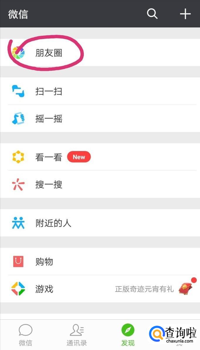 找到发现里面的朋友圈,点击朋友圈。