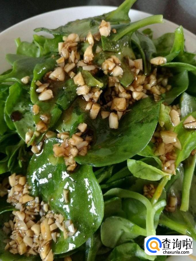 然后把煮熟的三七叶放在盘子里面,依次倒入蒜末、生抽、盐、蚝油、香油等,这样子凉拌鲜三七叶就做好了。