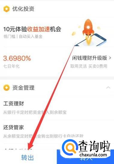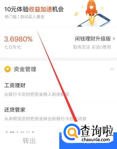 进入之后,点击“转出”,将里面的钱全部转出到余额,如图所示。